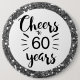 A silver glitter cheers to 60 years button which is great for a 60th birthday, 60th anniversary, etc. Please note there is not actual glitter on this product but a design effect.