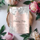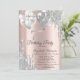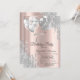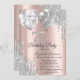 A modern, chic, and glamourous with silver glitter drips, and balloons on a rose gold background.