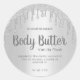 Labels dripping with silver glitter over a foil background image for a small body butter business.