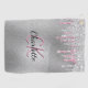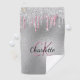 A faux silver metallic looking background decorated with pink and faux silver glitter drips, paint dripping look. Personalise and add a name, your monogram initials. The name is written with a hand lettered style script.
