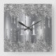 Silver Glitter Drips Monogram Personalized Square Wall Clock