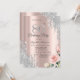 A modern, chic, and glamourous with silver glitter drips, roses on a rose gold background.