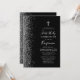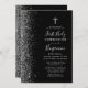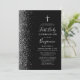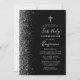 The left-hand edge of this elegant modern first communion invitation features a silver faux glitter border. A faux silver foil cross appears above the customisable text, which combines handwriting, copperplate and italic fonts in white on a black background. The reverse side features a matching silver and black design.