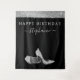 Elegant and Chic Modern Silver and Black Happy Birthday Photo Backdrop Selfie Background Tapestry Banner with Faux Glitter Silver High Heel Stiletto Shoes and personalised calligraphy script cursive name in black and white.
