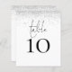 A size 4.5 x 5.6” semi-gloss 110lbs weight, which is of similar thickness to a postcard, with ONE per sheet. Silver Glitter Script Wedding Table Number. An elegant design with table in a set handwriting style script and your table number beneath. Easily personalise the number. A silver faux glitter border runs along the top edge. The same design is on the other side.