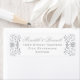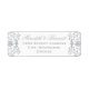 Glamorous silver glitter scrollwork frames the couple's names in elegant flowing script on this sophisticated wedding return address label. The address appears below in refined serif typography on a clean white background for a vintage-inspired finishing touch. All text is fully customizable.