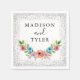 This chic napkin features the names of the couple in an elegant black script at the top, and a pretty colourful watercolor floral wreath arrangement at the bottom. A silver confetti glitter sparkles border and white background completes the design. This napkin can be easily personalised with your custom names,and is perfect for an engagement, wedding, or anniversary. You can even change the font, text colour and font style using the customise option!