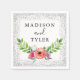 This chic napkin features the names of the couple in an elegant black script at the top, and a pretty colourful watercolor floral wreath arrangement at the bottom. A silver confetti glitter sparkles border and white background completes the design. This napkin can be easily personalised with your custom names, and is perfect for an engagement, wedding, or anniversary. You can even change the font, text colour and font style using the customise option!