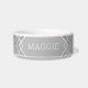Lovely neutral medium grey printed faux glitter pattern with an art deco-inspired modern geometric overlapping pattern with your cat or dog name printed directly on a white ceramic bowl.