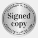 Book signing stickers featuring the text "signed copy" surrounded by a thin black border on a printed image silver grey gradient background and curved template fields for the author's name and website or other text top and bottom. Follow us on Instagram: @business.perfectlycustom and Facebook: @businessstationery for business related products, news and sales.