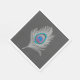 Vector drawing of a peacock feather, enhanced and rendered in a soft conte crayon effect - light silver grey / grey, with grey, turquoise and fuchsia pink eye, on a deep graphite grey background dinner napkins
