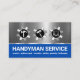 An upper silver layer and a cobalt blue piece is demarcated by a silver line. The cover features three faux silver sprockets that contain handyman tools which might represent some of the work/service you offer e.g. the hammer is for carpentry-home repair, the roller brush for home painting-remodeling and finally the trowel-shovel-fork can represent landscaping, gardening etc. The sprocket itself can represent mechanical repairs. The description tor their uses is left to your own interpretation.