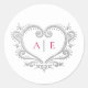 Silver and berry red decorative wedding stickers on a white background. Add your own couples' monogram initials. Ideal to seal gifts and favours at a winter wedding. Other colours and matching wedding items available. © Original heart design by Sarah Trett for www.mylittleedenweddings.com on Zazzle.