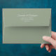 This beautiful wedding envelope is features a sage green background with silver grey floral curls and swirls on the inside flap. There is a printed return address on the back flap in fancy script lettering. The design is understated and simple, yet classic, chic and ornate. Perfect way to make your wedding invitations all the more special.