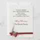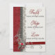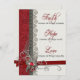 Elegant and elaborate design featuring glittering silver lace and flourishes, beaded swirl and red jewel on a subtly striped parchment and red damask background with elegant script. Complementary image on reverse with customisable text.