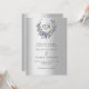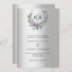 A faux silver looking background. A floral wreath made of lavender flowers and watercolored eucalyptus greenery. Personalise and add your monogram initials, names, and details. Black text.