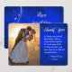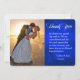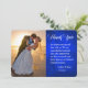 Your photograph is located on the left side of this horizontal photo template wedding thank you card. The right side has the text "Thank You" written in a pretty script in white, followed by your own special message. Your custom signature and wedding date is at the lower right. The back of the invitation has the same bright blue gradient background with an elegant silver leaf swirl, along with the famous "Love" quote from Scripture. All the text is easily customised to anything else you'd prefer.