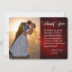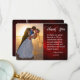 Your photograph is located on the left side of this horizontal photo template wedding thank you card. The right side has the text "Thank You" written in a pretty script in white, followed by your own special message. Your custom signature and wedding date is at the lower right. The back of the invitation has the same maroon red gradient background with an elegant silver leaf swirl, along with the famous "Love" quote from Scripture. All the text is easily customised to anything else you'd prefer.