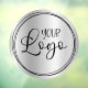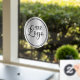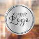 Add your own round transparent black or colourful PNG graphic branded business logo image on top a silvery light grey gradient circle to create a promotional window cling.