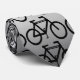 This striking tie features a contemporary design of an abstract pattern of repeating black bicycles on a silver, grey and white background.