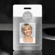 Add your own Logo Professional Corporate Work Name, Photo and Job Title Silver Metallic ID Photo Vertical Business Badge. This design is simple and easy to use by changing your first and last name as well as your job title and business head shot.