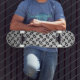A close-up of a steel elevator floor gives this skateboard a cool, industrial look.