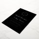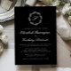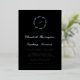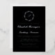 This elegant wedding invitation design features a script monogram initial encircled by a line art botanical wreath. The names appear in real silver foil script, with the rest of the text in classic serif font on a black background. The back of the card is solid black.