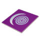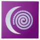 Graded, silvery crescent moon accompanied by a spiral pinwheel of light, on a deep purple evening sky background