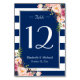 Silver Navy Blue White Stripes Floral Wedding Table Number Card.