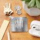 A simple three letter monogram design on a rounded square two-sided keychain.