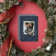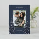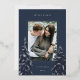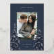 A modern and elegant Christmas holiday card design featuring a single vertical photo on a navy blue background. Two tall pine trees frame your photo, adorned with silver foil detailing. Personalise with your custom holiday greeting, family name and the year.
