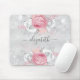 A feminine mouse pad for your office. A classic faux silver looking background. Decorated with pink and white roses, florals and faux silver glitter, sparkles. Personalise and add your name. The name is written with a modern hand lettered style script with swashes. To keep the swashes only delete the sample name, leave the spaces or emoji's in front and after the name.