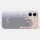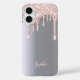An elegant, girly and glam case. Pink glitter drip, paint drip. Chic faux silver looking background. Template for your name written with a hand lettered style script.