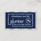 A blue grunge cover is encapsulated by a silver frame. Here lies a pipeline made from the word "plumber". Over at the top is your prestigious name followed by a silver faucet logo you can use with the contact details near the base.