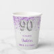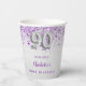 For a glamourous and feminine for a 90th birthday party. A faux silver metallic looking background. On the front and the back: Personalise and add a name and a date. Decorated with purple faux glitter dust. Number 90 is written with a balloon style font.