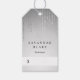 Chic hang tags for your boutique or retail business feature classic black lettering on a pale grey ombre background adorned with strands of faux silver foil string lights. Personalise with two lines of custom text. White space provided to write in your prices. Adjust the currency symbol as needed using the template.