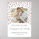 Custom photo engagement party welcome poster with silver and red confetti.