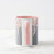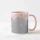 An elegant, girly and glam mug. Faux rose gold drip, paint drip. Chic faux silver looking background. Template for your name written with a hand lettered style script. Rose gold coloured letters.