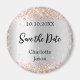 A Save the Date magnet for your wedding. A faux silver looking background, black text. Decorated with rose gold confetti.