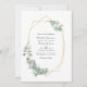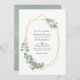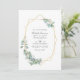 Forest eucalyptus greenery wedding photo invitation with gold geometric frame and silver sage watercolor reverse customisable to your event specifics. Ideal for any given theme or garden wedding. The QR code on the reverse directs to your wedding site where people can learn more and rsvp.