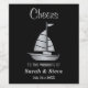 Customise these modern nautical sailing labels for a wedding or anniversary. The design features a silver sailboat on a black background. The background colour can be customised. Add the names of the bride and groom and add your wedding date.