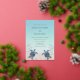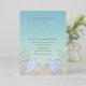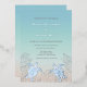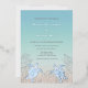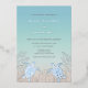 Two silver turtles on a turquoise sand beach style background with tropical leaves. Elegant beach wedding invitation card. With a details text at the backside.