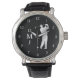 Here's an attractive watch that is perfect for the golf fan! It features a shiny silver silhouette golfer in full swing at the centre, with his triple monogram in matching silver running vertically at the left side. The numbers are also in silver, and everything is placed on a dramatic black background.