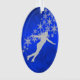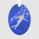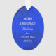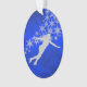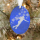 This Christmas ornament features a silver silhouette female ice skater in front of a spray of silver snowflakes. The image is placed on a bright blue abstract background. The back of the ornament has the same blue background with text fields for you to customise. Perfect for the ice skater or ice skating fan, and also makes a great keepsake for a child from parents or grandparents.