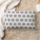 Mid-century modern inspired accent pillow features a simple clean glamourous design. A geometric starburst pattern of sparkly silver stars with grey accents on a white background. Each starburst features a light silver grey star overlapping with a larger sparkly silver starburst to create a white circle in the centre, each in a line creating an offset pattern reminiscent of mid-century modern rattan patterns.