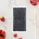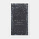 A sumptuous black watercolor night sky amidst sparkling silver stars cascading onto classic English script calligraphy with a splattering of shimmering silver ink spots.