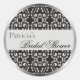An elegant silver colour swirls on a black background with a grey band to personalise with your message.The silver effect border frame gives a designer and chic touch to the round stickers for your bridal shower invitations and favours.
