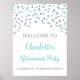 Custom text retirement party poster with silver and turquoise confetti.