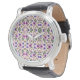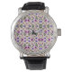 Silver watch with intricate purple and green floral pattern on the face. Black leather strap, stainless steel case. Elegant and detailed design.