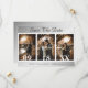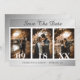 Elegant silver wedding photo save the date cards featuring an engagement photo collage on a silver background. Personalised silver wedding save the date cards. Customisable silver wedding save the date cards. Large numbers wedding save the date cards. 3 photo save the date cards. Silver photo collage save the date cards.